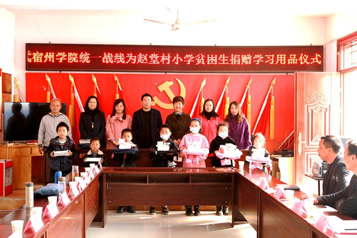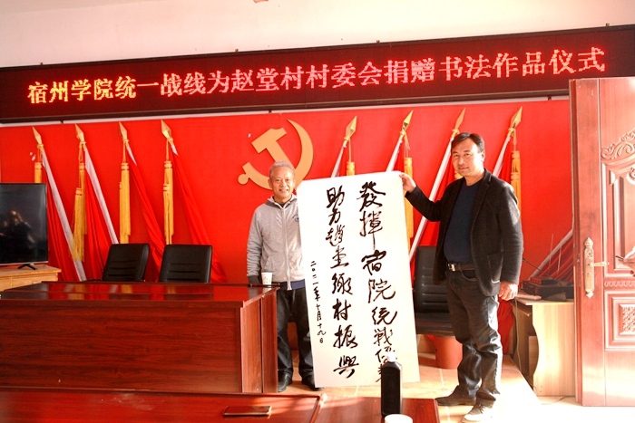 在赵堂村村委会,党委统战部部长李真、九三学社宿州市副主委方雪梅、民盟宿州市总支主委唐永刚、民进宿州学院支部主委张素枝、农工党党员、市政协委员曹少飞、知联会会长单玲玲、侨联代表崔琳等还向赵堂村小学生捐赠了红色读物、书包、文具盒、作业本等学习用品,并鼓励孩子们努力学习、健康成长,用优异的成绩回报社会和家乡,不辜负大家的殷切希望。民盟宿州学院支部主委傅华辰、曹少飞还现场泼墨挥毫,向赵堂村捐赠了书法作品。