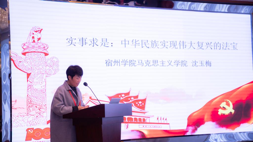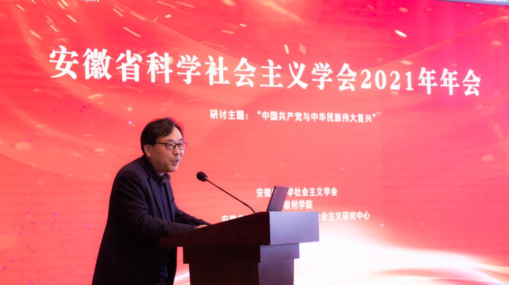为学习贯彻习近平总书记在庆祝中国共产党成立100周年大会上的重要讲话和党的十九届六中全会精神,回顾和总结中国共产党100年的光辉历程、重大成就和历史经验,弘扬伟大建党精神,助力实现中华民族伟大复兴,安徽省科学社会主义学会、宿州学院、安徽省社会科学院中国特色社会主义研究中心联合举办的以“中国共产党与中华民族伟大复兴”为研讨主题的安徽省科学社会主义学会2021年年会在宿州市举行。安徽省社会科学界联合会党组书记、常务副主席洪永平,宿州学院党委书记汪刘送,安徽省社会科学院党组成员、副院长沈天鹰,宿州学院党委委员、宣传部部长李真,宿州学院科研处副处长毛强等出席会议,来自安徽省委讲师团、省委党校及各地市市委党校、全省高校马克思主义学院的领导、专家、思政课教师代表80余人参加会议。会议开幕式由安徽省科学社会主义学会会长、安徽省社会科学院马克思主义研究所所长杨根乔主持。