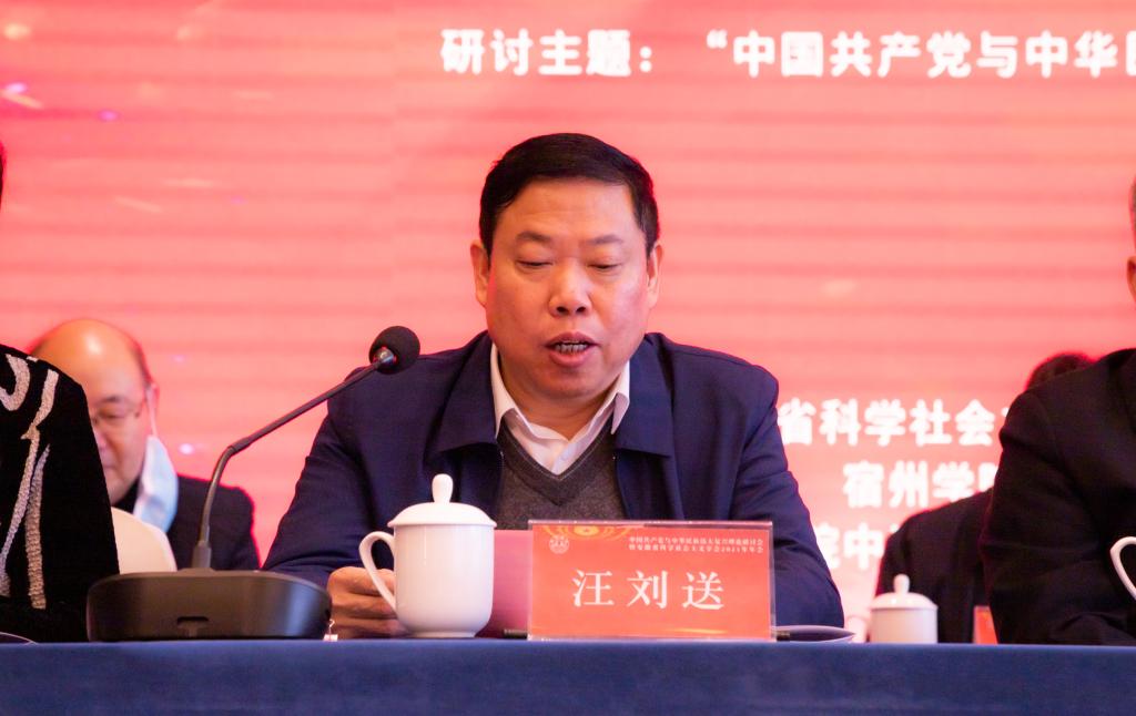 开幕式上,汪刘送代表主办方宿州学院对与会的领导、专家表示热烈欢迎和诚挚感谢。他指出,在全国上下深入学习宣传贯彻党的十九届六中全会精神,贯彻落实省第十一次党代会精神的关键时刻,全省党建和马克思主义理论工作者齐聚一堂,隆重召开安徽省科学社会主义学会2021年年会对我校发展是一个极大的促进。党的十九届六中全会审议通过了《中共中央关于党的百年奋斗重大成就和历史经验的决议》,这是中国共产党站在新的历史起点上制定的第三个历史决议,是历史性的、战略性的重大决策,对于我们党团结带领全国各族人民夺取新时代中国特色社会主义新的伟大胜利,具有重大的现实意义和深远的历史意义。汪刘送强调党的百年奋斗历程波澜壮阔,时间跨度长,涉及范围广,需要研究的问题也很多,期待来自全省的专家学者围绕本次会议主题,深入思考研讨、分享真知灼见。汪刘送表示,宿州学院是一所具有光荣传统和革命基因的学校,在中国共产党的创业史、革命史和理论创新史上贡献了自己的力量。在党的百年华诞之际,学校将继续传承红色基因,发挥自身优势,努力服务党和国家的战略需要,深入研究当代中国马克思主义、21世纪马克思主义,努力以更加昂扬的姿态、更加优异的成绩迈向新时代新征程,为全面加强党的建设,全面推进中华民族伟大复兴做出更大贡献。