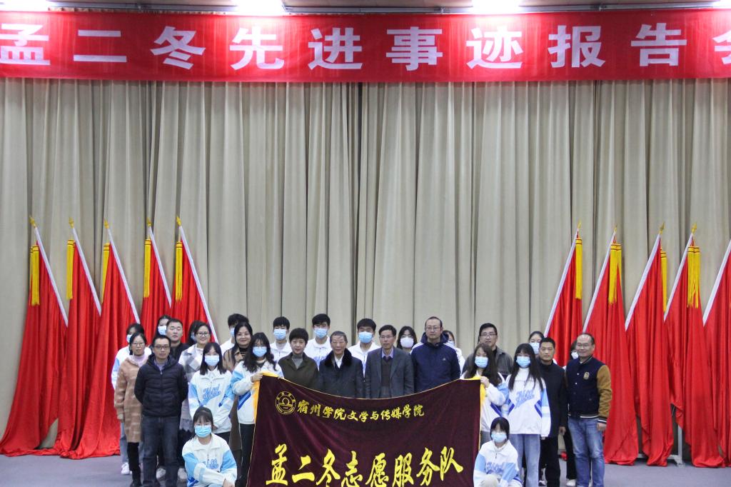 报告会举行了授旗仪式。李真将“孟二冬志愿服务队”队旗授予了孟二冬先生生前工作学习过的院系——文学与传媒学院,这是学校弘扬传承孟二冬精神的又一举措。10多年来,宿州学院以弘扬孟二冬先生赤诚奉献精神为核心,大力推进青年师生的社会责任感教育,大力开展志愿服务,成立“青年志愿服务团”,深入社区、深入基层,深入群众,服务地方建设发展,涌现了一批孟二冬式的先进教师和优秀学子,发挥了示范引领作用。