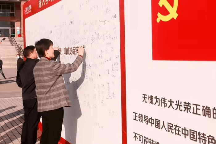 会前,与会人员前往图书馆楼前共同参观了党的十九届六中全会精神宣传展板,听了马克思主义学院教师费丹乙的讲解,并在“实现中国梦,功成不必在我 功成必定有我”签名版上郑重地签下了自己的名字。