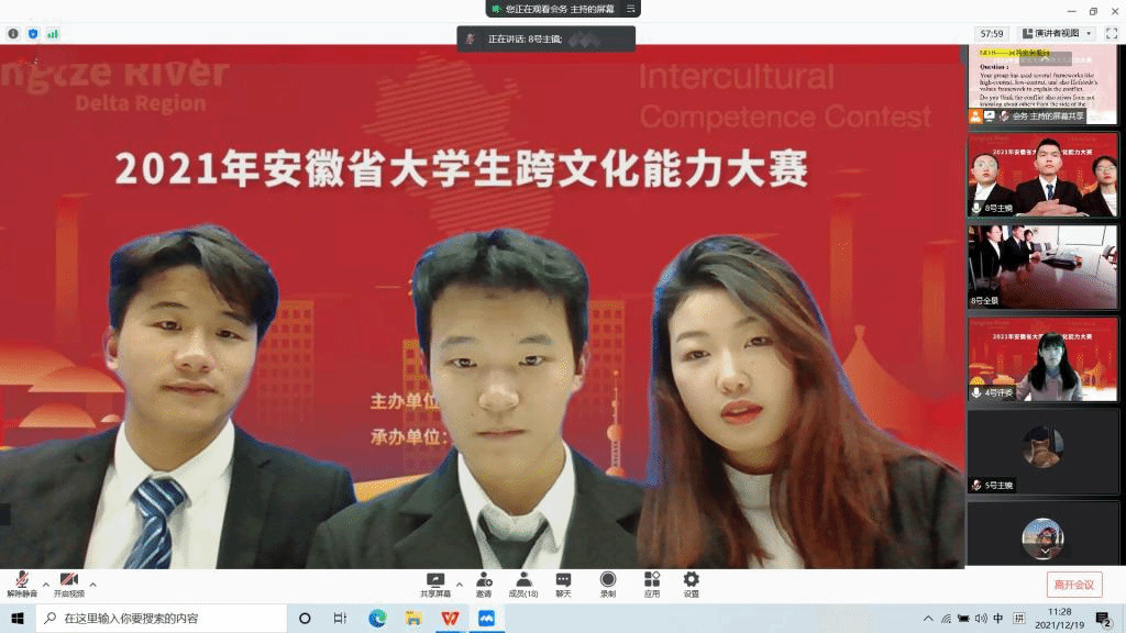 2021年12月21日,由安徽省教育厅主办,安徽大学承办的2021年安徽省大学生跨文化能力大赛于落下帷幕。我校代表队周密备赛、完美发挥,喜获三等奖。