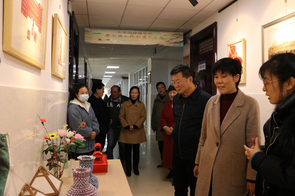 临近期末,盘点收获的季节。12月22日,文学与传媒学院举办了第七届文化创意艺术作品展。校党委副书记、校长张莉、党委委员、副校长张英彦、党委委员、宣传部部长李真、教务处处长王红艳、教务处副处长唐永刚等参观了展览。