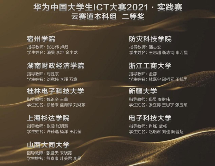 12月25日,由中国高等教育学会指导,华为技术公司主办的“华为中国大学生ICT大赛2021年全国总决赛”颁奖典礼以在线的方式全网直播,本次华为ICT大赛全国总决赛覆盖省市30个,电子科技大学、华中科技大学、南方科技大学、宿州学院等高校29支队伍参加。我校选手在此次“华为中国大学生ICT大赛2021年全国总决赛—实践赛Ÿ云赛道本科组”中荣获二等奖(队员:潘昊、李坤、金小龙,指导教师:张志伟、卢彪),并成功晋级“华为ICT大赛全球总决赛”。