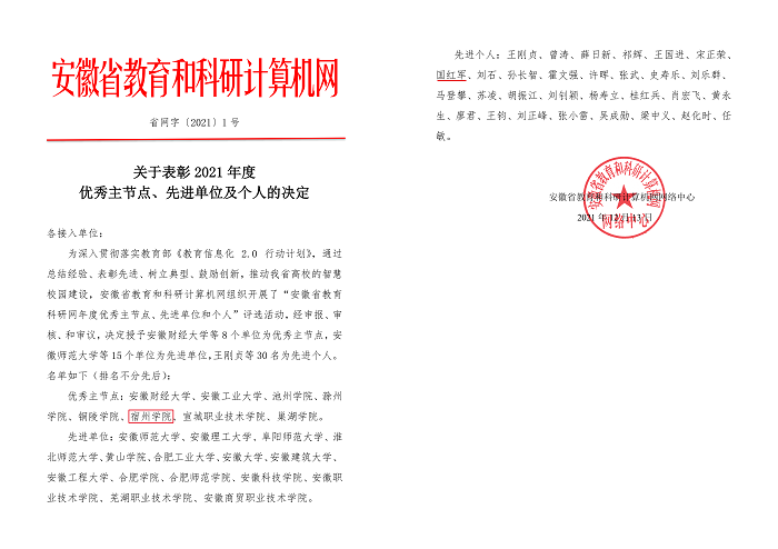 为促进高校信息化建设,推动我省教育信息化快速发展,在省教育厅指导下,安徽省教育和科研计算机网组织开展了“安徽省教育科研网年度优秀主节点”、“安徽省教育科研网2021年度先进单位和先进个人”评选活动。我校荣获2021年度优秀主节点单位,办公室网络中心国红军老师被评为2021年度先进个人。