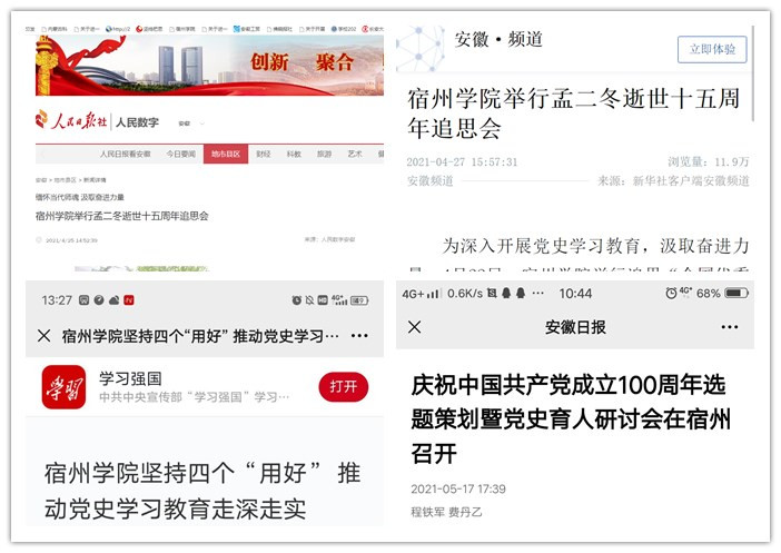 打造立体化宣传格局。开辟党史学习教育专题网站,在微信公众号、微博等新媒体平台设置“党史学习教育”“党史百年天天读”等栏目,刊发稿件200余篇,编印42期《党史学习教育简报》。充分发挥宿州学院习近平新时代中国特色社会主义思想学习研究中心、马克思主义学院等作用,加强百年党史理论研究,举办庆祝中国共产党成立100周年选题策划暨党史育人研讨会、中国共产党与中华民族伟大复兴研讨暨安徽省科学社会主义学会,撰写理论文章40余篇。我校党史学习教育的特色做法受到新华网、人民网、学习强国、安徽新闻联播、安徽日报等主流媒体的报道。