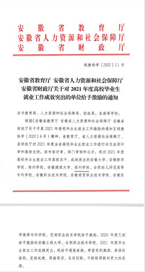 3月24日,安徽省教育厅、安徽省人力资源和社会保障厅、安徽省财政厅联合发布了《关于对2021年度高校毕业生就业工作成效突出的单位给予激励的通知》,全省共激励表彰高校10所(本科5所),我校是受到激励表彰的5所本科高校之一。