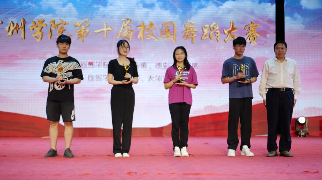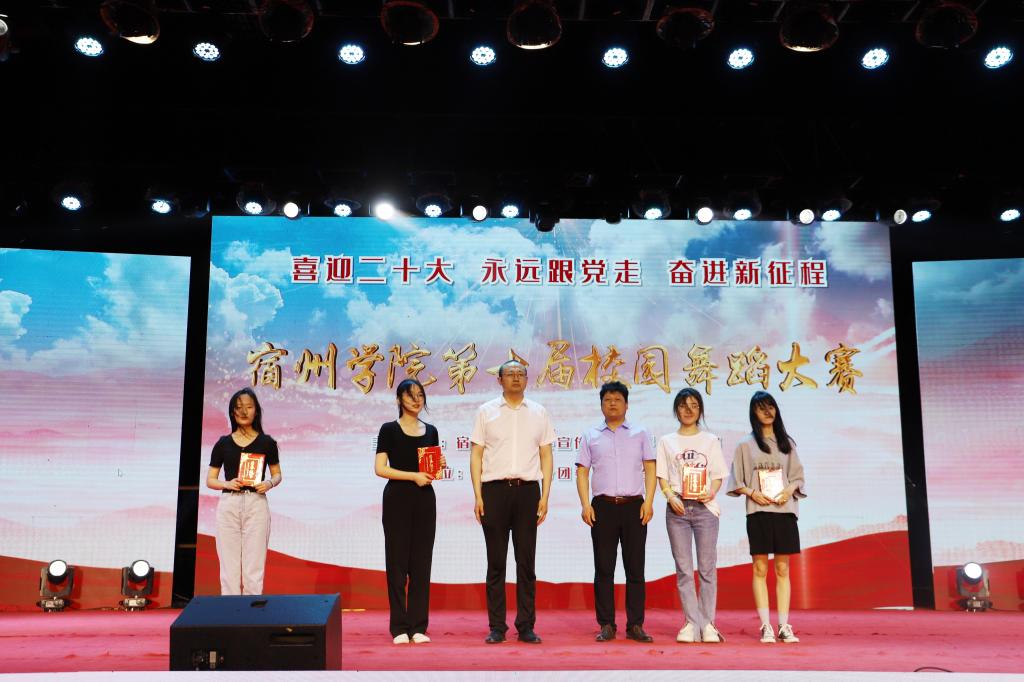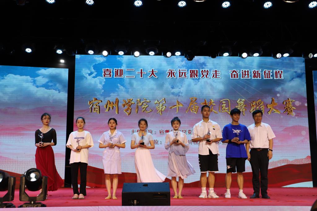 5月25日晚,宿州学院“喜迎二十大、永远跟党走、奋进新征程”第十届校园舞蹈大赛在教育园区田径场顺利举行。此次比赛由党委宣传部、团委、党委学生工作部主办,音乐学院分团委、大学生艺术团承办。院党委书记汪刘送,党委委员、纪委书记、监察专员王俊,党委委员、宣传部部长李真,党委学生工作部部长李月云,团委书记凌峰,音乐学院院长王善虎、副书记(临时负责)徐强出席并为获奖集体和个人颁奖。