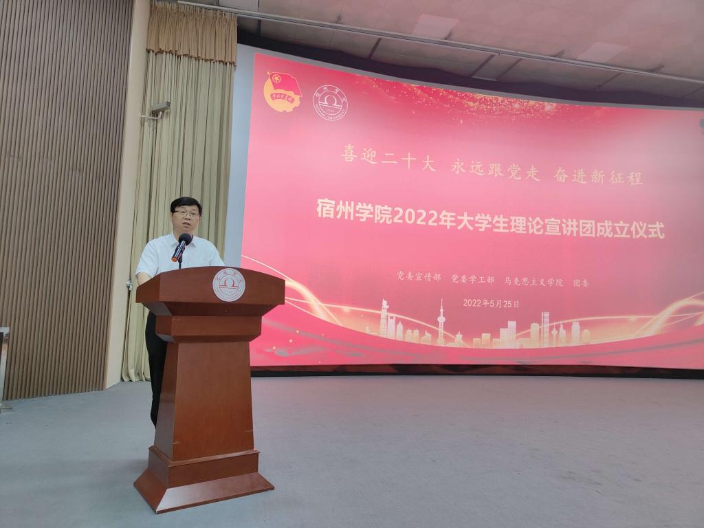会上,李真宣读《关于成立宿州学院2022年大学生理论宣讲团的通知》;马克思主义学院李小燕代表指导教师、大学生理论宣讲团成员廖弦代表学生先后进行发言。