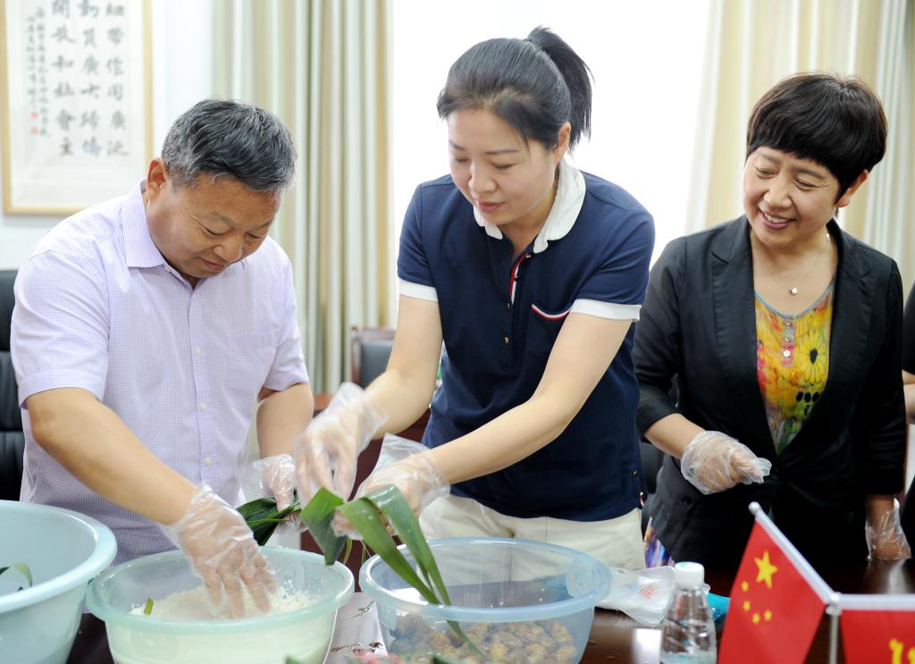 活动最后还精心设计了“端午粽子DIY”环节。院侨联准备了白净的糯米、青绿的粽叶和香甜的红枣。在大家的共同努力下,一个又一个不同形态的粽子逐渐呈现,现场气氛和谐温馨,其乐融融。