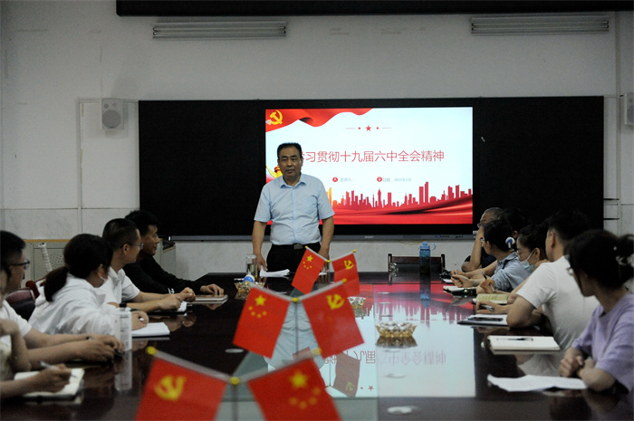 6月6日下午,院党委委员、副院长李亮在体育学院会议室宣讲党的十九届六中全会精神,体育学院休闲体育教研室教师党支部全体成员、全体学生党员参加宣讲会。