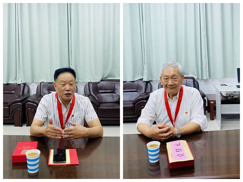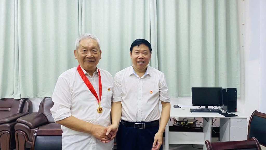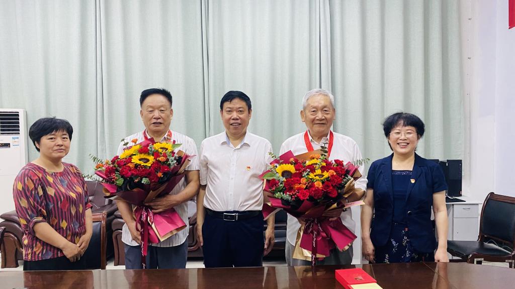 汪刘送向“光荣在党50年”党员李其华、黄德源同志分别赠送鲜花、佩戴纪念章并送上节日祝福和慰问金。他代表学院党委向两位老同志表示热烈祝贺,并致以崇高的敬意和诚挚的问候!