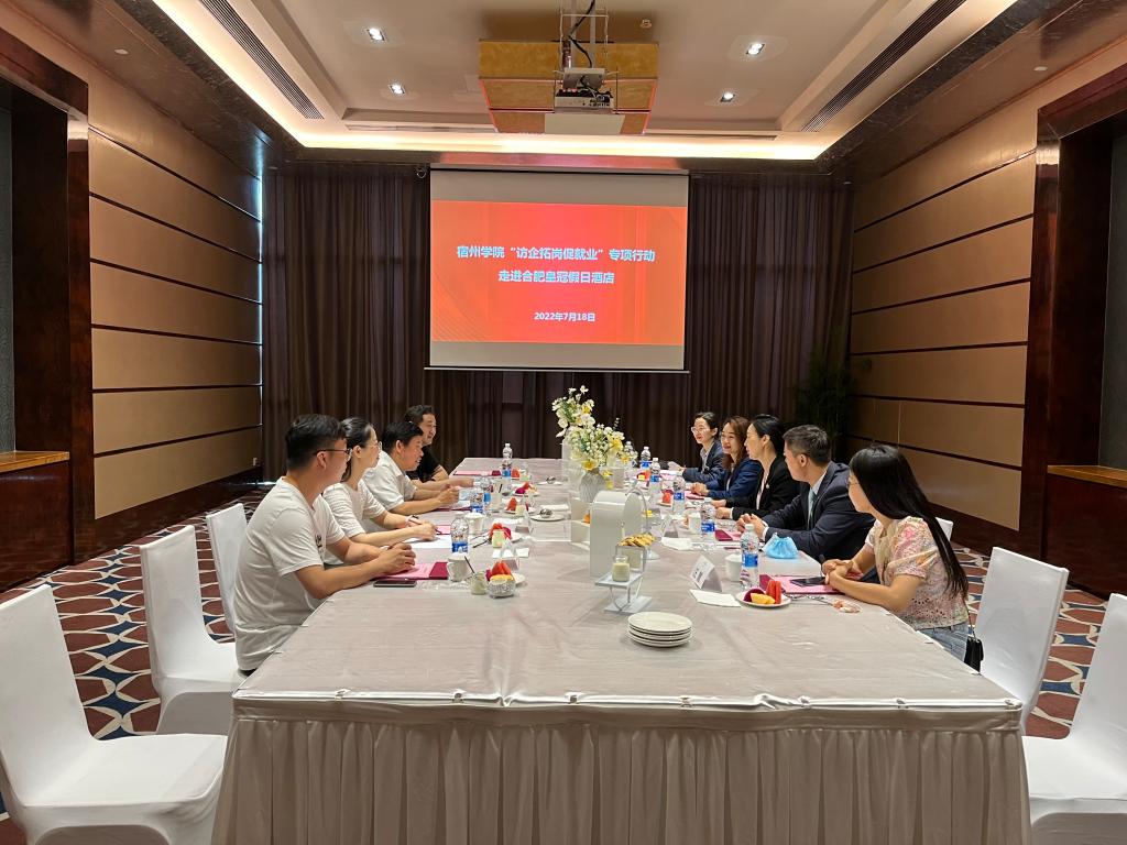 为贯彻落实党中央、国务院和省委、省政府关于高校毕业生就业工作的决策部署,推深做实“高校书记校长访企拓岗促就业专项行动”,进一步了解企业用人需求,挖掘岗位资源,助力高质量就业,7月18日,院党委书记汪刘送带队赴合肥访企拓岗,走访合肥皇冠假日酒店、合肥元一希尔顿酒店、安徽绿城物业管理有限公司等企业,管理学院党委副书记、院长韩传龙等陪同考察。