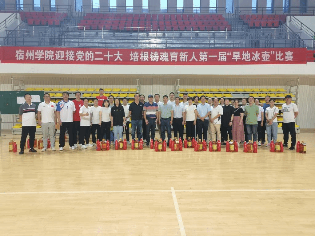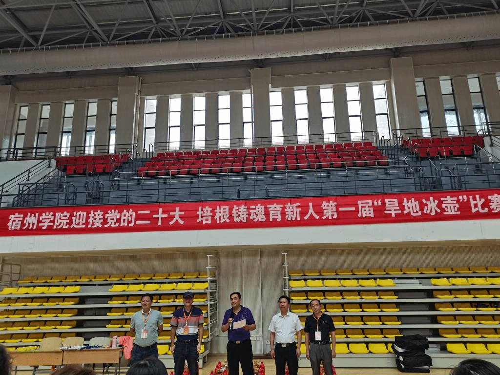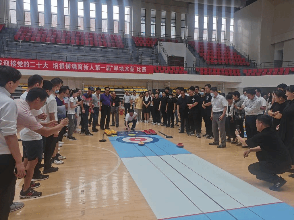为喜迎党的二十大胜利召开,庆祝我国第38个教师节,加快推进学院高质量发展,全力实现“两个建成”,提高教师团队凝聚力,激发教师工作活力,新学年创造新辉煌,9月9日下午,由宿州学院体育运动委员会、工会、党委教师工作部主办,体育学院承办的“迎接党的二十大,培根铸魂育新人”第一届“旱地冰壶”比赛在体育馆顺利举办,比赛共吸引各二级学院、各职能部门约40支队伍200余名教职工参与。宿州学院党委委员、副院长李亮、杨维志、工会主席郭良宗、体育学院党委书记李高、院长白明、各二级学院党政负责人及各职能部门负责人出席了本次比赛。