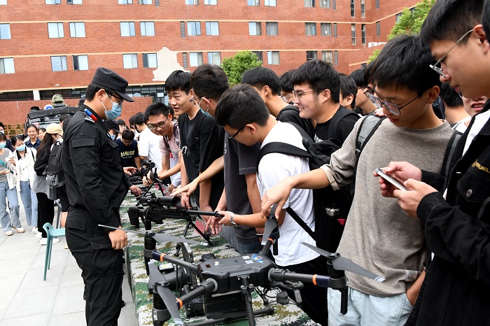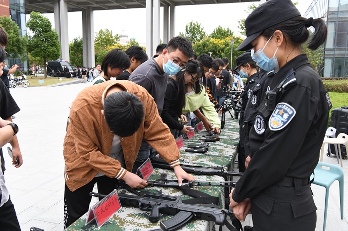 器械展示区展示了反恐武装的枪支器械,吸引大量同学参观体验。