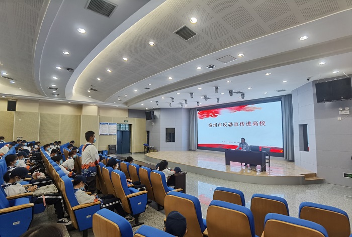 宿州市公安局反恐支队在工科楼招聘大厅开展反恐安全知识讲座。讲座结合典型案例,介绍了恐怖主义的主要形式、特点及危害,分析了当前反恐形势的严峻性和复杂性,就如何辨别和防范恐怖主义等方面进行了全面讲解。