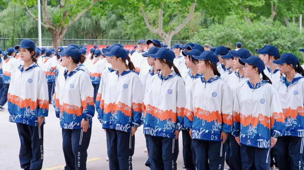 二冬大道上,方阵整齐,梧桐葱葱郁郁,青春活力四射。新生脚跟靠拢并齐,双腿绷直站立,两手紧贴裤缝,腰杆挺直,肩膀后张,目视前方,身姿挺拔,神态昂扬。