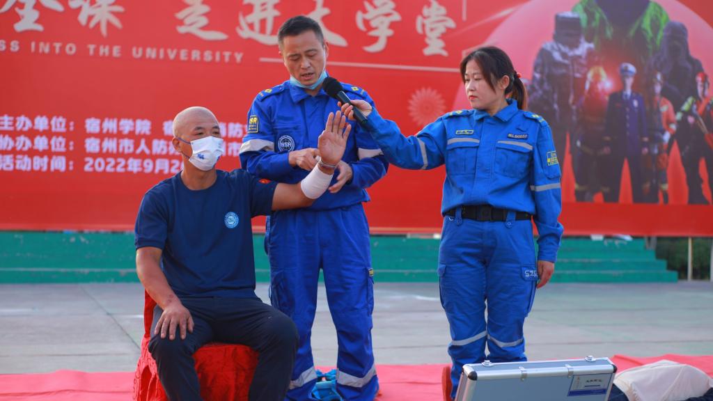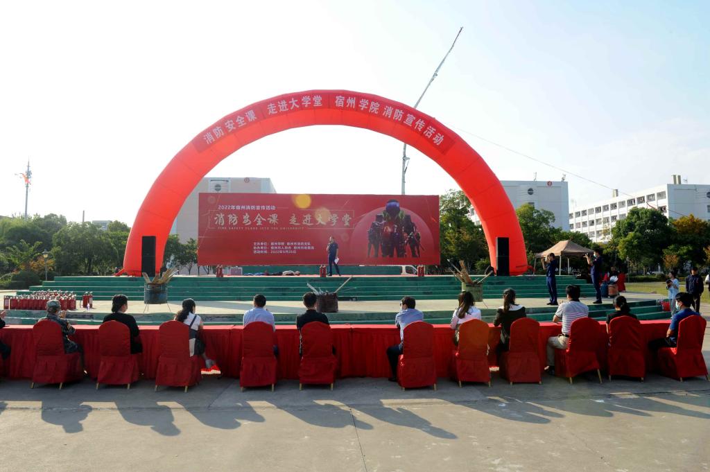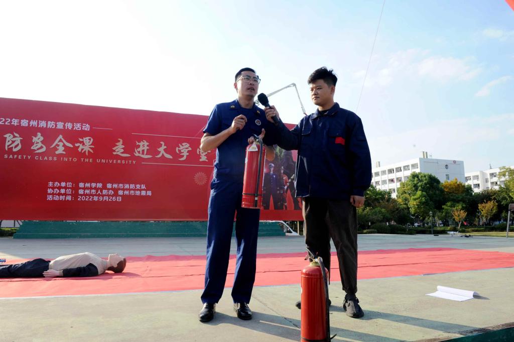 秋光绚丽,金风送爽,为深入推进学校消防安全宣传教育工作,提高2022级新生的消防安全意识和消防安全素质,增强师生自防自救能力,9月26日下午,“消防安全课、走进大学堂”消防知识宣传活动在宿州学院荟萃广场开展。本次活动由宿州市消防救援支队、宿州市人防办、宿州市地震局、宿州学院共同举办。武警宿州支队副参谋孙治东、宿州市地震局副局长侯凤霞、宿州市人防办党组副主任孔庆军出席活动,宿州市消防救援支队参演官兵、蓝天救援队志愿者、宿州学院相关院部负责人及2022级全体新生参加了此次活动。