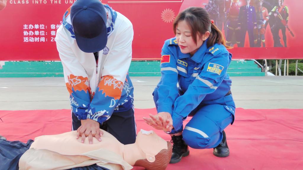 宿州市蓝天救援队志愿者们向同学们讲解了遇到水患,身处险境时的自救方式,心肺复苏应急处置操作方法。消防安全课在同学们携消防官兵一起,高举右手宣誓“珍爱生命,远离水域”的响亮誓言中圆满结束。