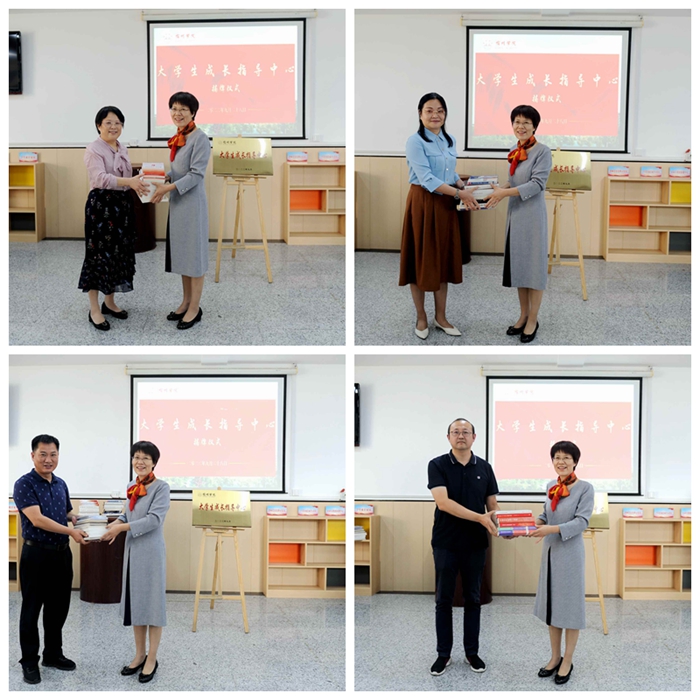 张雁凌首先介绍了大学生成长指导中心的板块和功能。随后,王俊和张雁凌共同为宿州学院“大学生成长指导中心”揭牌,陈啸吟、李月云、杨刚、凌峰分别代表各自单位向大学生成长指导中心赠书。