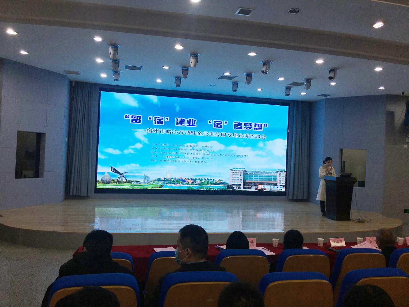 宣讲招聘会分为企业推介、现场答疑、企业招聘等环节。在企业推介环节,宿州市经开区和高新区的八家企业人力资源部负责人分别通过播放企业宣传片、PPT展示以及面对面交流等方式,就公司概况、工作环境、企业文化、人才需求及薪资待遇、发展晋升前景等学生关心的问题做了详细的介绍,使同学们更加了解公司及招聘岗位概况,更好地规划自己的职业未来。