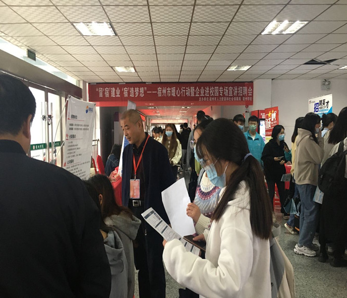 为充分发挥校园招聘的主渠道作用,强化就业服务供给,深化校地、校企合作交流,10月26日下午,我院联合宿州市人力资源和社会保障局,在工科楼招聘大厅举办“留‘宿’建业‘宿’造梦想”——宿州市暖心行动暨企业进校园专场宣讲招聘会。本次招聘会共有14家宿州市企业参会,提供工作岗位326个,主要涉及化学化工、工程技术、机械设计、生物医药、电子商务、市场营销、教育等行业,需求专业覆盖面广。