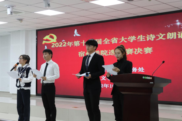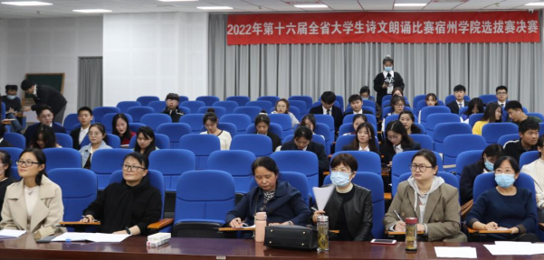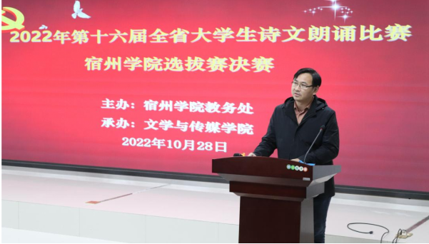 10月28日,由宿州学院教务处主办,文学与传媒学院承办的2022年第十六届全省大学生诗文朗诵比赛宿州学院选拔赛决赛在管理学院103报告厅举行,教务处副处长刘超,创新创业办公室主任赵军,文学与传媒学院国家级普通话测试员和省级普通话测试员李娟、刘影、陈艳梅、张桂玲、徐晗、李雪玲、吴琼瑶担任评委。
