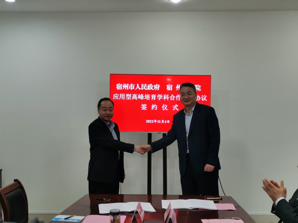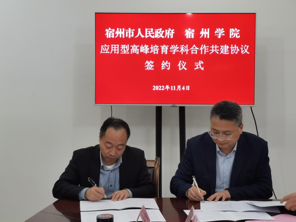 刘博夫和李福华分别代表宿州市人民政府和宿州学院签订了应用型高峰培育学科合作共建协议。根据协议约定,宿州市支持宿州学院资源与环境、机械、食品与营养三个学科按Ⅲ类高峰培育学科进行建设,并对每个学科年均给予不低于1000万元的专项经费支持。市校共同组建“宿州学院应用型高峰培育学科建设工作推进领导小组”,建立健全沟通协调与落实机制,通过人才联合培养、平台共同培育、项目联合攻关等方式,积极解决宿州市资源勘查、节能环保、新材料、高端装备暨智能制造、绿色食品、预制菜等产业发展所需的关键技术问题,实现教育链与人才链、产业链与创新链深度融合,促进双方互利共赢、共同发展,为现代化美好安徽建设及新阶段现代化美好宿州建设提供强有力的科技支撑、人才支撑和智力支撑。