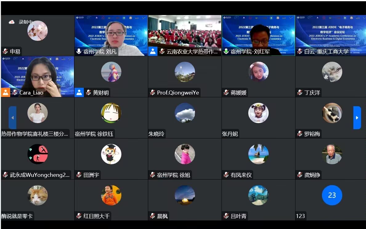 11月12-13日,2022第三届JEBDE“电子商务与数字经济”会议论坛以线上线下结合的方式顺利举行。本次会议由中国信息经济学会互联网经济与跨境电商专业委员会、重庆工商大学管理科学与工程学院主办,宿州学院、电子商务及供应链系统重庆市重点实验室、昆明市电子商务与互联网金融研发中心联合承办。清华大学陈国青教授、中山大学谢康教授、北京邮电大学吕廷杰教授、重庆工商大学校长孙芳城教授、宿州学院校长李福华教授担任大会名誉主席,云南财经大学叶琼伟教授、中国人民大学程絮森教授、重庆工商大学管理科学与工程学院院长黄钟仪教授、宿州学院商学院副院长(临时负责)刘红军教授、云南农业大学热带作物学院院长杨学虎教授担任大会主席,来自清华大学、中国人民大学、中山大学、南京大学、重庆工商大学、云南农业大学、宿州学院等国内外20余所高校200余名电子商务与数字经济领域专家学者参加论坛。