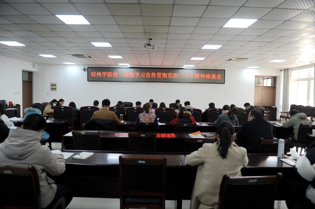 王俊充分肯定了学院统一战线取得的成绩,并就进一步做好统一战线学习宣传贯彻党的二十大精神,强调三点要求。一要全面深刻领会党的二十大召开的重要意义。党的二十大是在全党全国各族人民迈上全面建设社会主义现代化国家新征程、向第二个百年奋斗目标进军的关键时刻召开的一次十分重要的大会,是一次高举旗帜、凝聚力量、团结奋进的大会。广大统战成员要深刻把握党的二十大精神内涵,深刻领悟“两个确立”的决定性意义,增强“四个意识”、坚定“四个自信”、做到“两个维护”,切实把思想和行动统一到党的二十大精神上来,把智慧和力量凝聚到落实党的二十大各项决策部署上来。二要深刻把握党的二十大对统战工作作出的重要指示。党的二十大立足中国共产党在新时代新征程上全面建成社会主义现代化强国、以中国式现代化全面推进中华民族伟大复兴的中心任务,对巩固和发展最广泛的爱国统一战线作出重大战略部署,指明了新时代统战工作的前进方向。要把学习党的二十大精神和学习习近平总书记在中央统战工作会议上发表的重要讲话结合起来,同贯彻落实《中国共产党统一战线工作条例》结合起来。三要学以致用,将党的二十大精神贯彻落实到各项工作中去,做到“两个结合”。将学习党的二十大精神与服务学院“两个建成”和高质量发展结合起来,与服务地方经济社会发展结合起来,以具体举措和实际行动贯彻落实党的二十大精神,为学院“两个建成”和地方经济社会发展贡献统战力量。