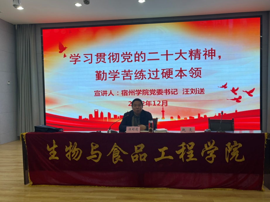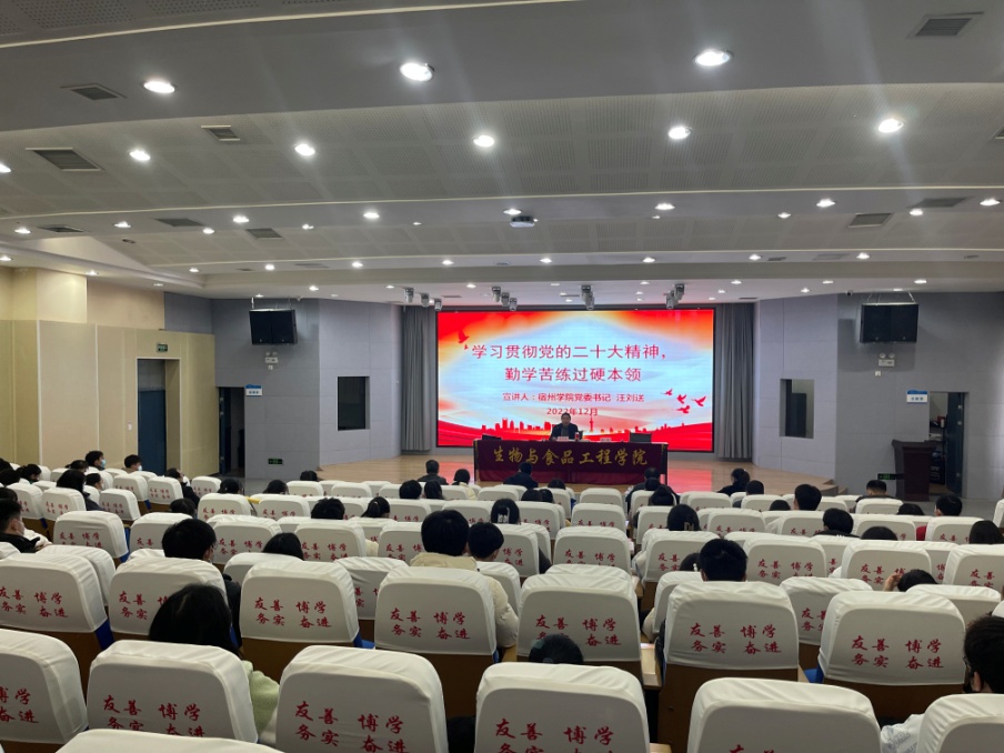为深入学习宣传贯彻党的二十大精神,领会中国式现代化的创新理论思想,加深师生党员对中国式现代化的认识,12月7日下午,党委书记汪刘送以“学习贯彻党的二十大精神,勤学苦练过硬本领”为主题,为生工学院师生宣讲党的二十大精神。生工学院科级以上干部、辅导员、教师代表及22级学生代表参加宣讲会。宣讲会由生工学院党委书记赵亮主持。