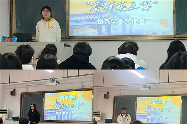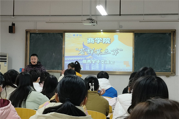 为进一步端正学风,有效地促进全院学生学习的积极性,养成良好的学习习惯,营造良好的学习氛围。商学院于12月7日在实训楼B205举办“荟群英之萃”优秀学子经验交流会。20会计学1班陈玉原、21会计学1班李雨龙、21国贸叶雨婷3名优秀学子进行了经验交流,学生事务管理科副科长孙茂顺老师到场指导,商学院2022级各专业学生参加了交流会。