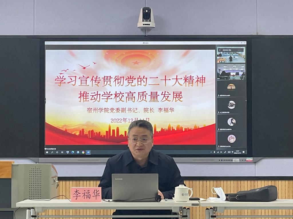 最后,李福华指出,中国共产党已走过百年奋斗历程。我们务必不忘初心、牢记使命,务必谦虚谨慎、艰苦奋斗,务必敢于斗争、善于斗争,坚定历史自信,增强历史主动,谱写新时代中国特色社会主义更加绚丽的华章,把党的二十大绘就的美好蓝图转变为宿州学院的新时期答卷。