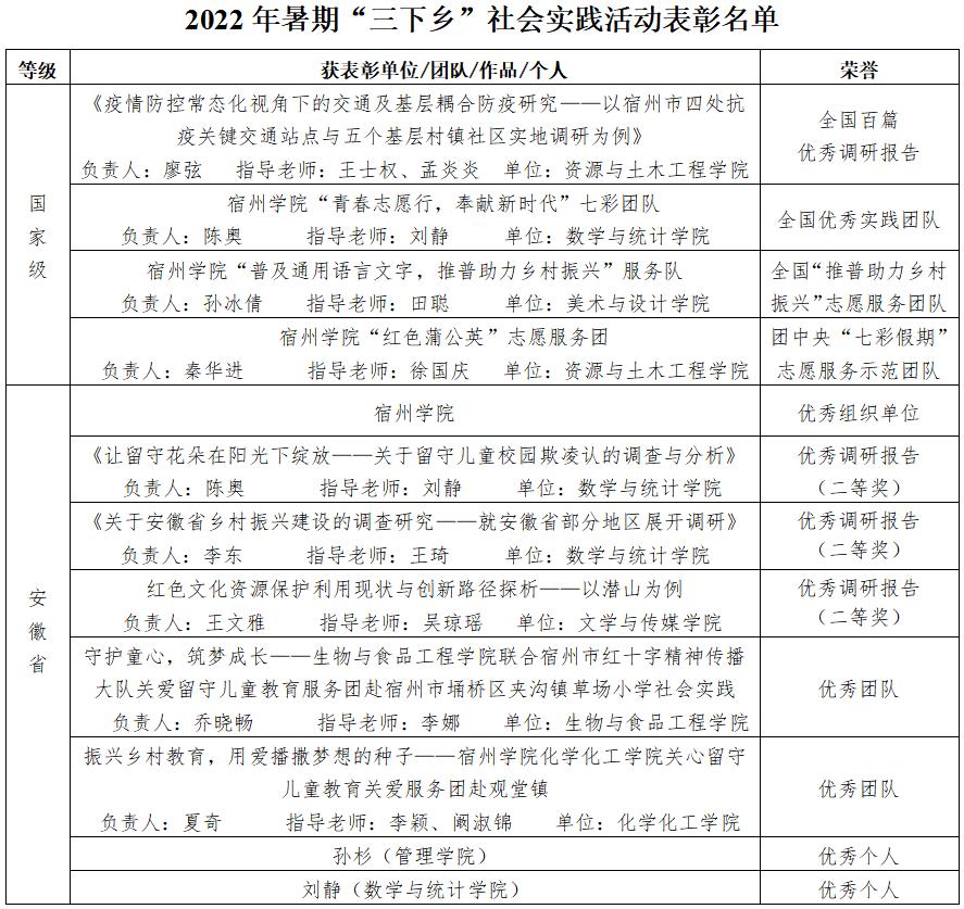 近日,2022年全国大中专学生志愿者暑期“三下乡”社会实践活动评选结果公布,我院社会实践工作再获共青团中央表彰,1篇调研报告获评全国优秀调研报告(全国共100篇),1支团队获评全国社会实践优秀团队,2支团队获评全国志愿服务示范团队。在安徽省“三下乡”社会实践评奖评优公示中,宿州学院获评优秀组织单位,获评优秀调研报告3篇,优秀实践团队2支,优秀个人2名。