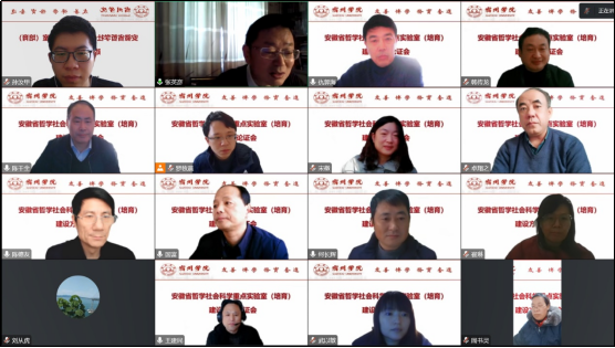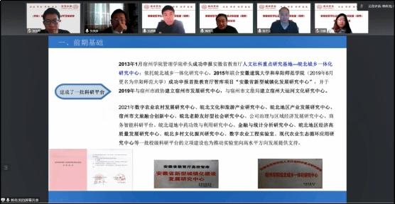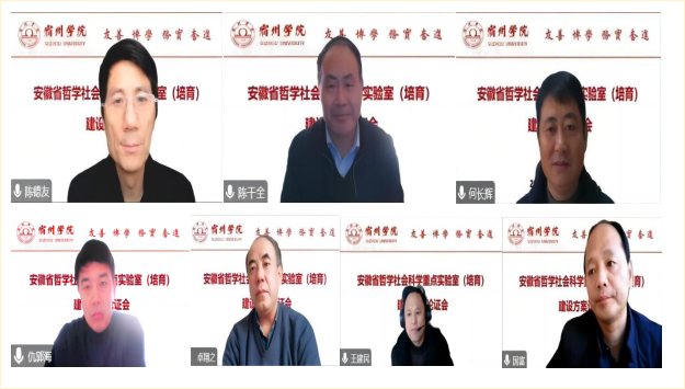 12月25日上午,宿州学院召开安徽省哲学社会科学重点实验室(培育)建设方案论证会(线上),安徽省委宣传部理论处处长唐国富、省政府发展研究中心社会发展研究处处长陈干全、省广电集团纪委书记陈德友、省社科联普教咨询(科研)处处长仇郭海、省社科院办公室主任何长辉、淮北师范大学教务处处长卓翔芝、安徽理工大学经济与管理学院副院长王建民共7名专家组成专家组参与方案论证。宿州学院副院长张英彦主持会议,数字科技与皖北产业振兴重点实验室(培育)主任韩传龙,副主任宋徽、刘从虎、周书灵、武以敏、崔琳以及科研处学科建设科科长罗牧晨参加会议。