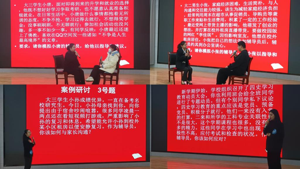 案例研讨环节,主要考察辅导员综合运用理论分析问题、研判问题和解决问题的能力。谈心谈话环节,主要考察辅导员对学生特征、学生成长成才规律的了解把握程度,对学生的教育引导能力、解决思想困惑和实际问题的能力。谈心谈话环节以情景再现方式进行,展现辅导员与学生面对面深入交流的过程,谈话内容涉及思想认知、奖学金评定、班干竞选、心理健康、突发事件处理等多方面。参赛选手在谈心谈话过程中,从容应对,情理兼顾,达到了教育人、引导人的作用,展现了我院辅导员良好的专业素质。