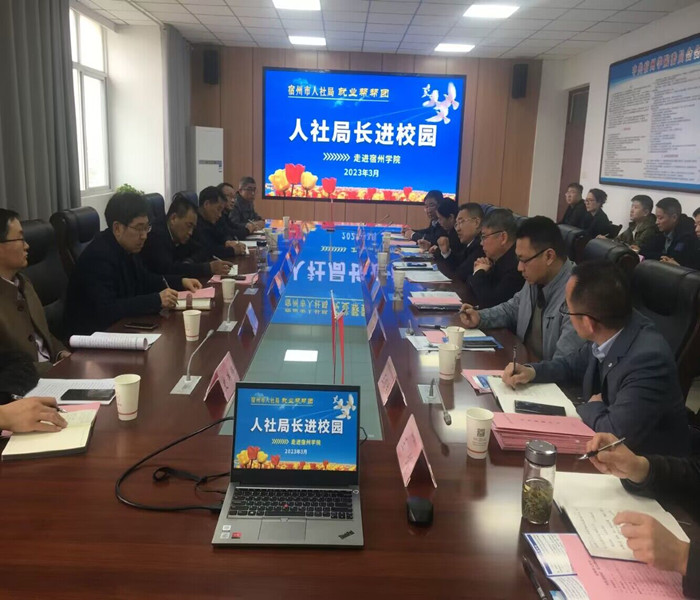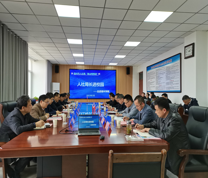 为深入学习贯彻党的二十大精神,认真贯彻落实党中央、国务院“稳就业”“保就业”决策部署,深入落实教育部“春季促就业攻坚行动”和“访企拓岗促就业”专项行动,搭建政校企三方合作平台,进一步促进毕业生高质量充分就业及留宿就业创业,3月29日,我院联合宿州市人力资源和社会保障局开展“人社局长进校园”走访调研活动。宿州市人社局党组书记、局长、二级巡视员刘光,市人社局党组成员、副局长何龙,市经开区人力资源中心主任华莉,市高新区就业办主任巨松,市宿马园区人力资源中心主任梁枢,市人社局就业促进和失业保险科科长王根生,市人才服务中心副主任王剑,宿州市部分企业代表,院党委委员、副院长李亮,招生就业处全体工作人员,部分二级学院党委书记参加本次活动。会议由李亮主持。