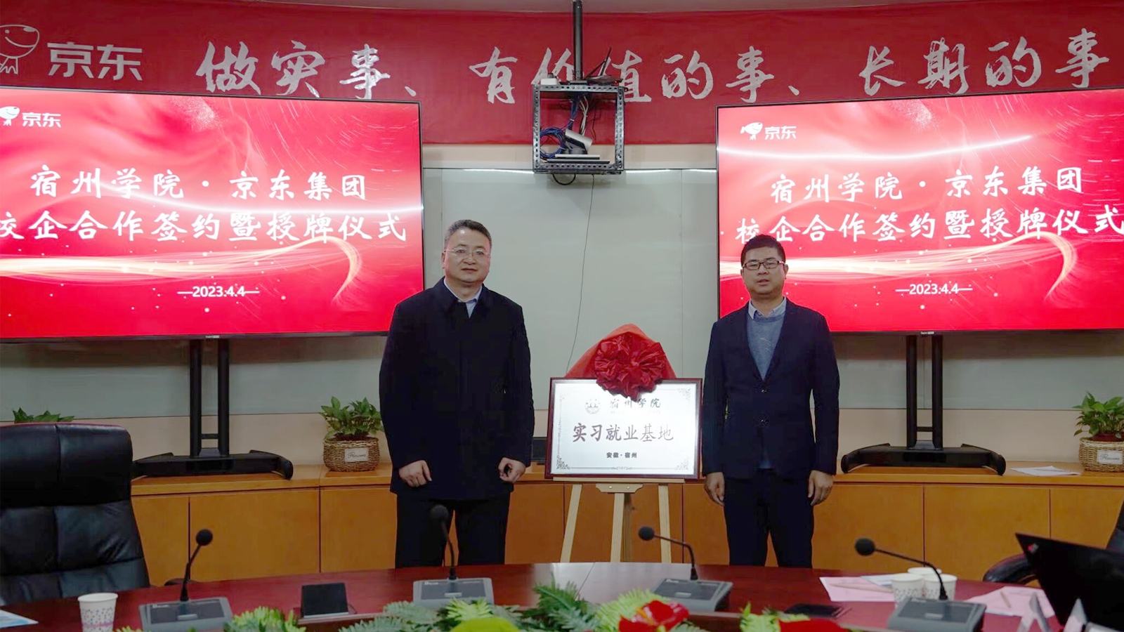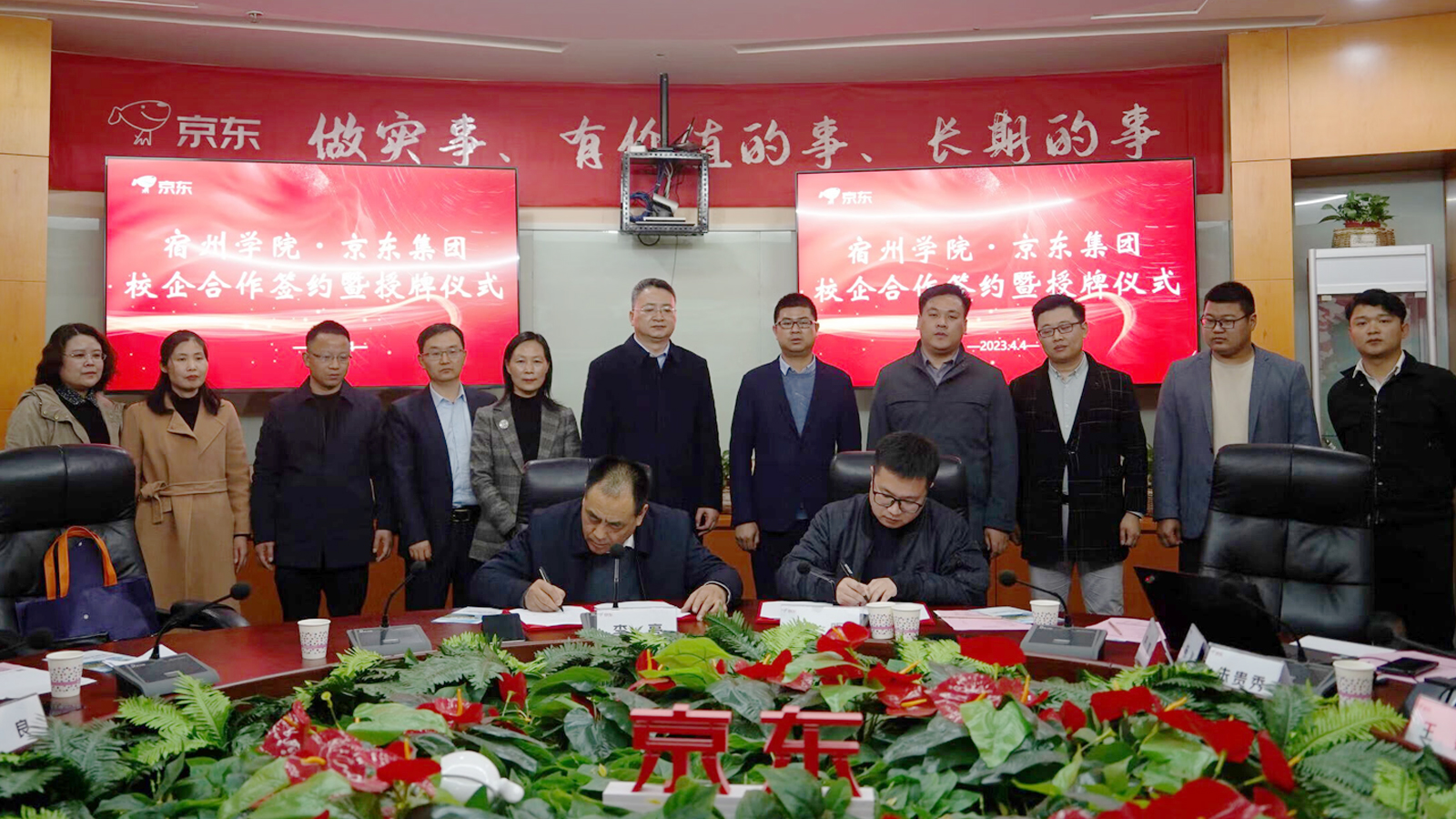 为深入贯彻落实教育部“春季促就业攻坚行动”,加强校企合作,2023年4月4日,党委副书记、院长李福华,党委委员、副院长李亮带队教务处、招就处、商学院一行8人赴江苏京东信息技术有限公司开展访企拓岗促就业专项行动,并举行“宿州学院•京东产教融合中心”合作共建签约仪式。教务处处长王红艳、招生与就业处副处长李金莲、商学院党委书记肖良、商学院院长刘红军、商学院副院长(教学)宁青青、实习实训中心主任胡发刚陪同参加。