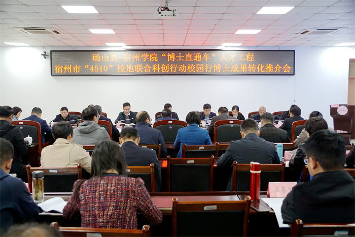 为深入贯彻党的二十大精神,落实宿州市“4510”校地联合科创行动,进一步加强砀山县与宿州学院融合力度,持续推进“博士直通车”人才工程在人才交流培养、技术服务、科技攻关、平台共建、成果转化等领域落地落实,4月7日上午,砀山县—宿州学院“博士直通车”人才工程——宿州市“4510”校地联合科创行动校园行活动我院教育园区校区成功举办。砀山县委常委、组织部长孙鹏,砀山县政府副县长宋文广,砀山县政府副县长(挂职)李琦,宿州学院党委书记汪刘送,党委副书记、院长李福华,党委委员、副院长李亮,党委委员、纪委书记、监察专员王俊,党委委员、副院长杨维志出席活动。砀山县相关部门负责同志,我校组织部、校办公室、团委等相关部门负责同志,创业园有关项目负责人,二级学院院长、科研副院长及有关项目博士等参加活动。