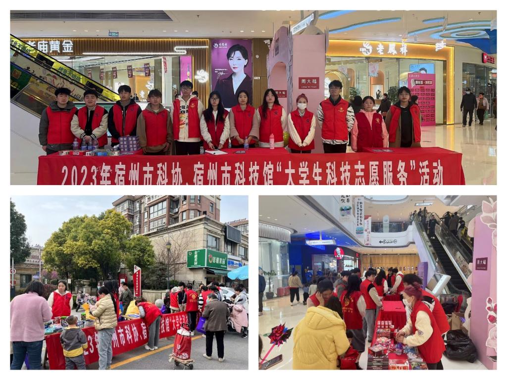 为大力弘扬科学精神、普及科学知识、提升公民科学素质,3月份,宿州学院青年志愿者总队与宿州市科协、宿州市科技馆联合开展了“大学生科技志愿服务”活动,志愿者们在人流量较大的社区和商场牵拉横幅,摆放指导书、宣传单,准备各类玩具、小礼品,开展科普宣传活动。