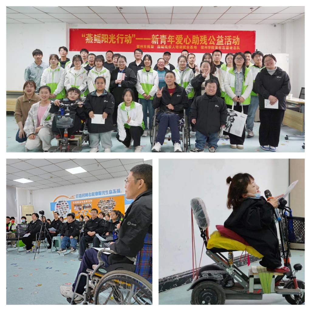 春风送暖学雷锋,助残服务在行动。为进一步弘扬扶残助残传统美德,营造全社会关心关爱残疾人的良好氛围,由宿州市残疾人联合会指导,宿州学院志愿者总队联合燕鳐残疾人培训就业基地举行了“新青年爱心助残公益活动”,开展了“我与我身边的励志故事”分享,鼓励残疾人士克服自身身心障碍、规划未来,携手共创美好的明天。同时,为了传承爱幼助弱的优良传统,我校青年志愿者到宿州市儿童培智中心开展了关爱特殊儿童志愿服务活动。