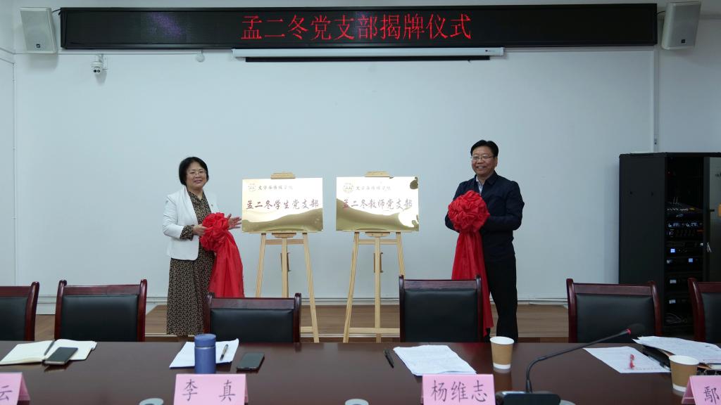 追思会后,学习孟二冬精神座谈会在文学与传媒学院会议室举行。会上,院党委委员、组织部部长陈啸吟宣读了《关于成立“孟二冬教师党支部”“孟二冬学生党支部”的批复》,她希望两个党支部在今后的建设当中要创特色、创品牌,在校级、省级、国家级三级联创的双创工作中做出更突出的贡献。杨维志和陈啸吟为宿州学院“孟二冬教师党支部”“孟二冬学生党支部”揭牌。