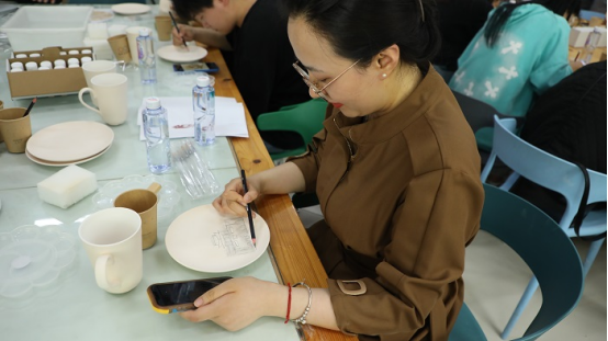 李月云强调了本次陶艺活动的目的与意义。陈述立希望大家能够在陶艺制作过程中能放松心情,培养美感,陶冶情操。陶艺工作室王子彪老师展示了陶瓷绘画的主要技法和注意事项,并讲述了图案创作的基本原理,激发了大家的创作热情。
