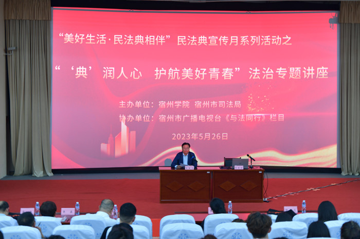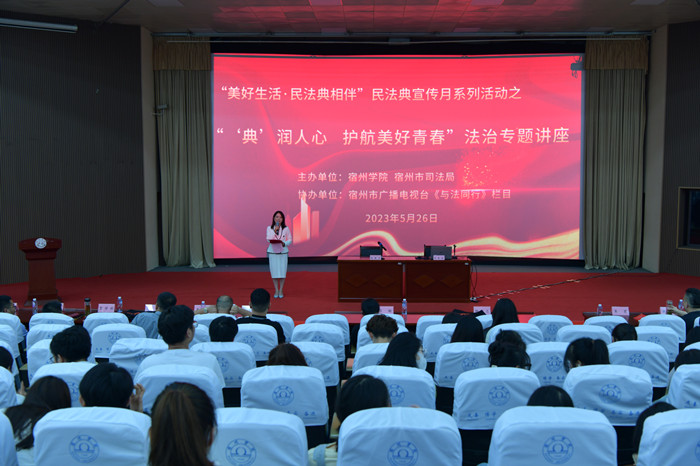 今年5月是第三个“民法典宣传月”,宣传主题为:“美好生活·民法典相伴”。5月26日下午,我院与宿州市司法局、宿州广播电视台《与法同行》节目组联合举办了“美好生活·民法典相伴”民法典宣传月系列活动之“‘典’润人心 护航美好青春”法治专题讲座。宿州市司法局普法与依法治理科科长张娅,宿州广播电视台综合广播总监黄涛,院党委委员、副院长杨维志,党委委员、党委宣传部部长李真,办公室主任岳尧、团委书记凌峰、党委学工部副部长贾学彬、办公室法治科负责人聂鹏,各二级学院党委副书记、学生管理科科长、法治联络员、各班级法治宣传员,学生代表等400余人参加。讲座由宿州广播电视台主持人易君主持。