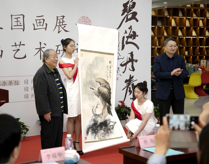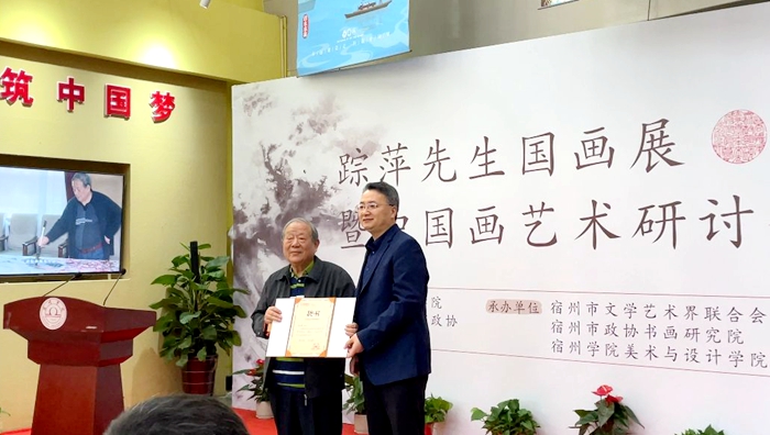 李福华宣读《关于成立宿州学院中国画艺术研究院的通知》文件,并为吴踪萍先生颁发院长聘书和捐赠证书。吴踪萍先生早年考入南京师范大学,受教于国画大师傅抱石,其山水,构图气势磅礴,山高水远,意趣天成。踪萍爱画山水,更爱画鹰,曾拜国画大师张振铎门下,笔下的鹰极具个人风格。二十世纪九十年代,美国白宫收藏踪萍的雄鹰图;2002年,踪萍被邀进驻中南海创作多幅作品,2013年,再受中南海之邀,创作巨幅山水画《东方欲晓》。吴踪萍先生向宿州学院捐赠22幅作品,其中中国画作品2幅,写生作品20幅。