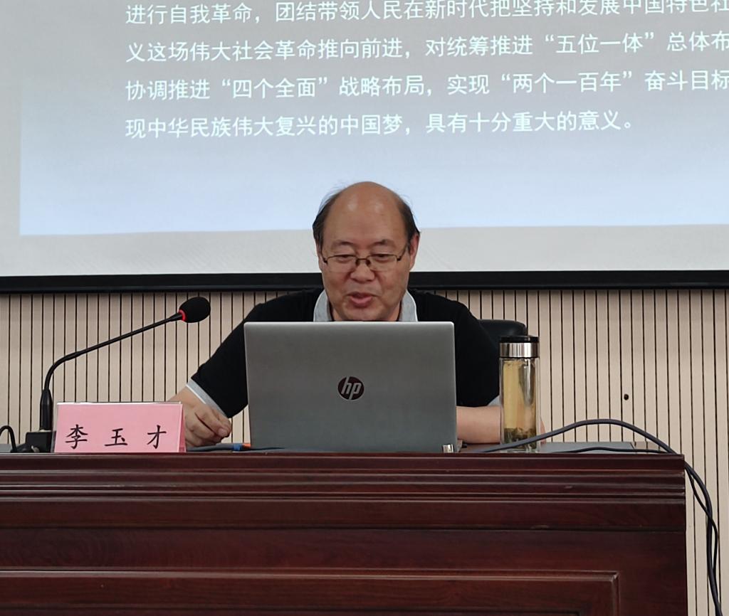 会上,邀请马克思主义学院李玉才教授作“读原著学原文悟原理 精读精讲新思想”专题辅导报告。李玉才教授就《习近平著作选读》(第二卷)中篇目《不忘初心,牢记使命》进行精读精讲。从介绍文章背景、重温习近平总书记在“不忘初心,牢记使命”主题教育总结大会上的讲话精神、《不忘初心,牢记使命》中的6个方面具体内容等,用生动的语言、详实的数据、正反两方面的典型案例,全面系统地、深入浅出地、突出重点地进行了精度辅导、精讲阐释,让大家坚定了“为党育人 为国育才”的初心使命。