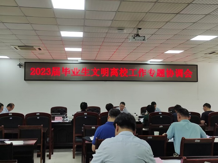 会议第一阶段,学工部部长李月云宣读了《关于做好2023届毕业生文明离校工作的通知》,对2023届毕业生文明离校工作进行了具体安排。相关职能部门分别就毕业生党团组织关系转接、就业、费用结算、图书归还、退宿、接送车辆安排、校园安全、宣传报道等工作进行了布置。
