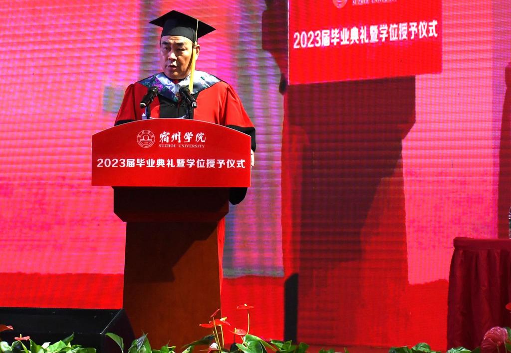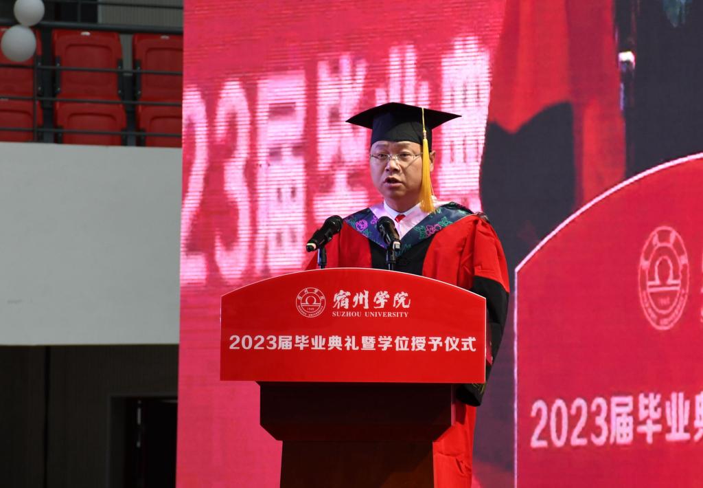 仪式上,院党委书记汪刘送代表学院党委、行政向圆满完成学业的全体毕业生表示最真诚的祝贺,向辛苦养育他们的父母,辛勤培养他们的老师表示衷心的感谢。汪刘送指出,在宿州学院生活学习的四年里,同学们砥砺勤学、历练本领、增长才干,学校每一片绿荫都留下了同学们青春的身影,每一寸土地都镌刻着同学们奋斗的足迹。汪刘送进一步指出,2023届毕业生中,1045名同学光荣加入中国共产党;135名同学获评省级优秀毕业生;118名同学获评校级优秀毕业生;1000多人次在各类学科技能竞赛中斩获佳绩;406名同学考取研究生继续深造;27名同学携笔从戎、强军报国;74名同学自主创业;还有不少同学立志扎根基层、投身西部建功立业。学院为同学们取得的成绩感到骄傲和自豪。