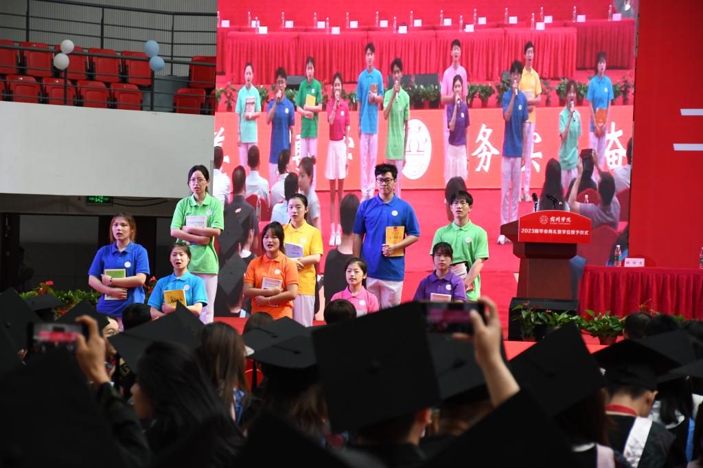 仪式开始前,2023届全体辅导员以快闪的方式为毕业生送去暖场歌曲《祝你一路顺风》,表达了老师对毕业生的诚挚祝福。同学们表演的《老师你好》,唱响了莘莘学子对母校的依依不舍和感恩之情。