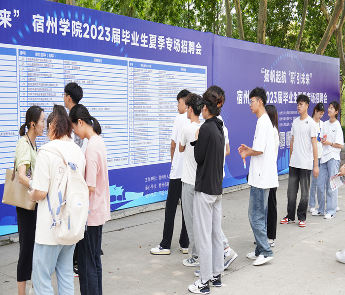 为推进学习贯彻习近平新时代中国特色社会主义思想主题教育走深走实,抢抓毕业生离校前就业冲刺关键期,6月20日,我院联合宿州市人力资源和社会保障局在教育园区校区举办“扬帆起航 ‘职’引未来”2023届毕业生夏季专场招聘会,宿州市就业管理中心主任沈飞,副主任任启强,人力资源市场管理办公室主任胡红梅,招生就业处处长杨刚,各二级学院党委书记、院长,党委副书记到场指导,学生事务管理科科长、毕业辅导员及2023届毕业生参加招聘活动。